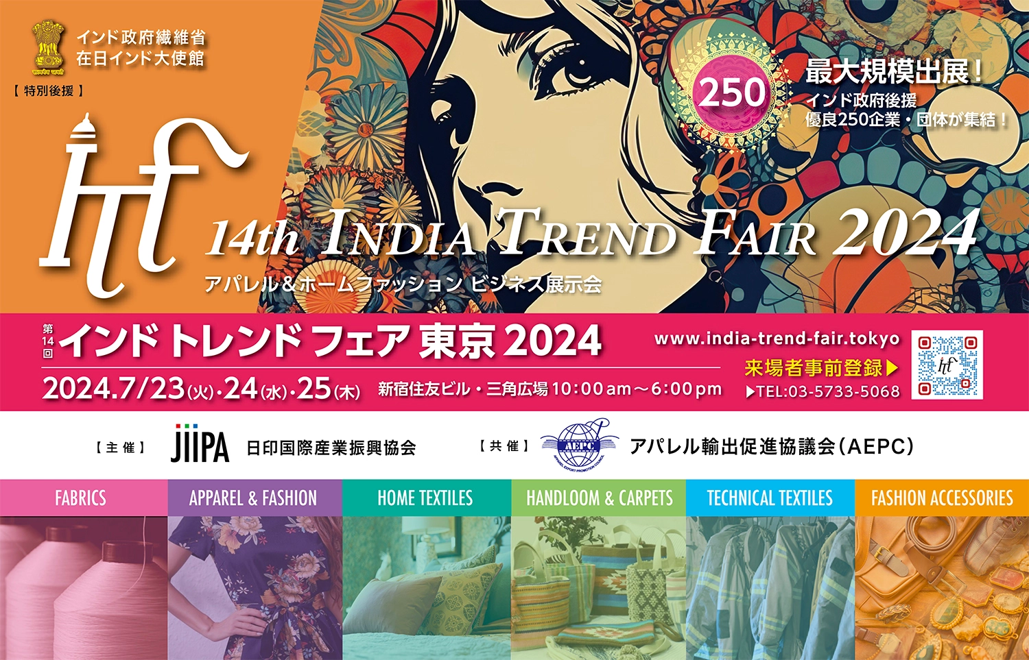 NPO法人 日印国際産業振興協会(JIIPA)はインド政府繊維省と在日インド大使館後援・ご協力のもと第3回インドトレンドフェア東京(冬展)を1月11(水)、12(木)、13(金)の3日間、ベルサール渋谷ガーデンにて開催をすることとなりました。